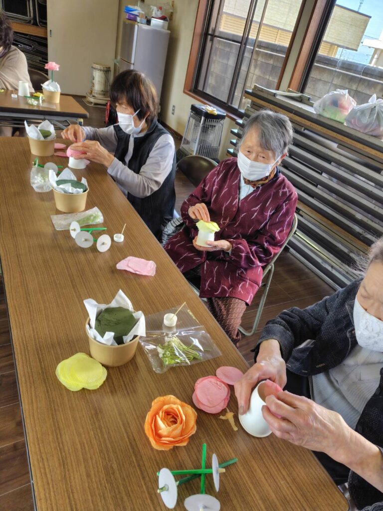原地区と上中瀬地区が一体となって開催するいきいきサロンでは、地域のつながりを深めながら、楽しい時間を共有しています。4月12日には、「キッチンペーパーで作るバラの花」に取り組みました。紙コップに貼り付ける簡単な作業で、色鮮やかな作品が数多く完成し、会場は和やかな雰囲気に包まれました。